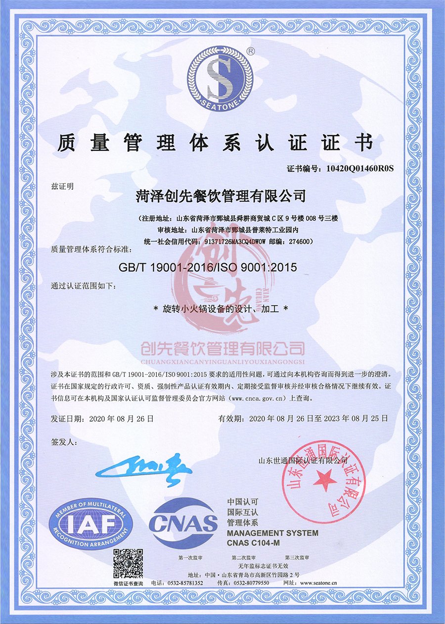 现在是网络时代,信息传播速度很快,同时各行各业呈现透明的状态,接踵而来的是各种广告铺天盖地的宣传,夸大宣传虚假宣传的情况络绎不绝,虚假资质情况屡见不鲜,ISO9001质量体系认证证书体现公司的实力,是对产品质量的认可和肯定,菏泽创先餐饮管理有限公司通过了ISO9001质量体系认证,证书编号为:10420Q01460R0S