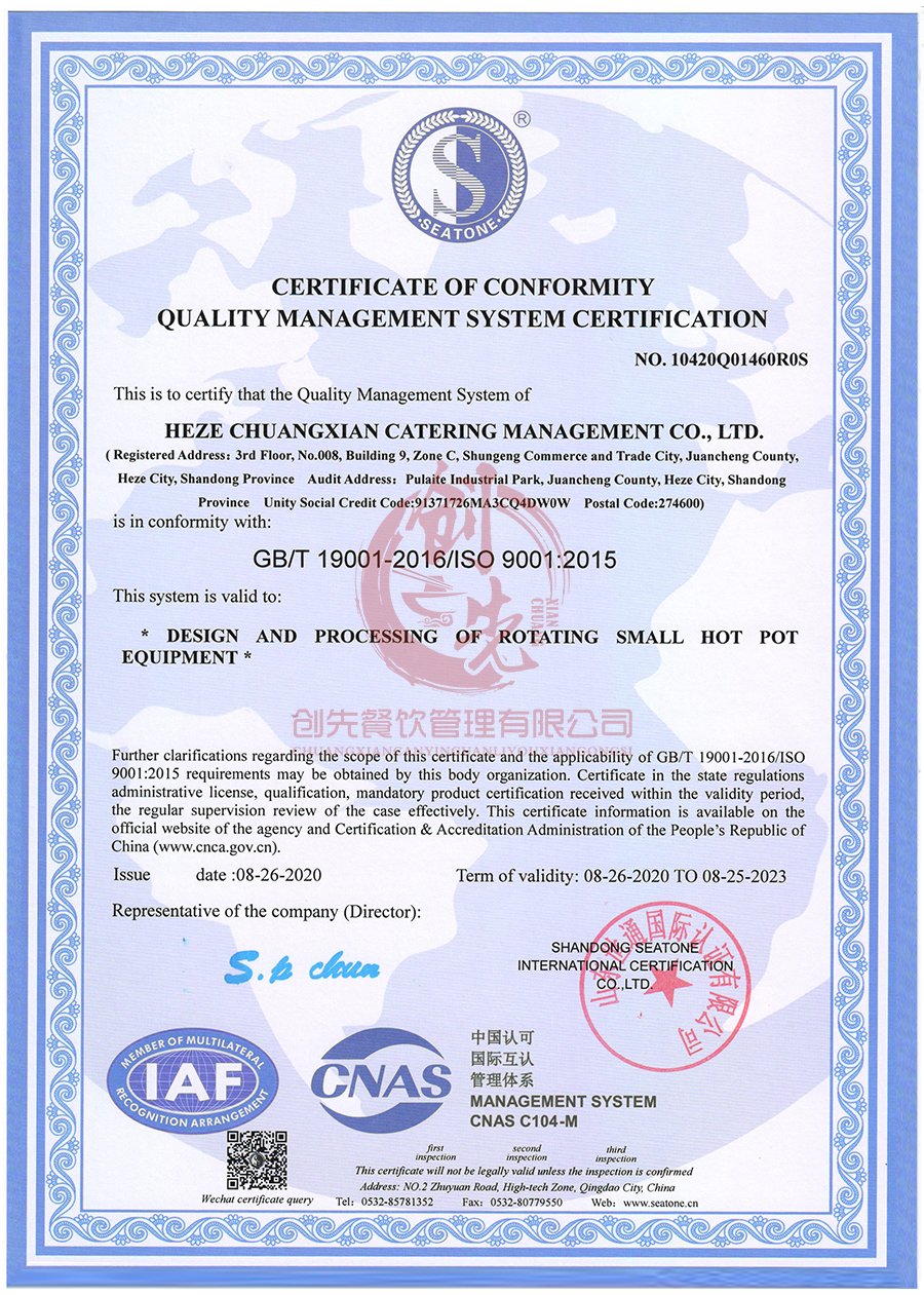 同时我们也严格遵循“ISO9001”规范运行,对旋转火锅设备原材料的选择、设备加工的品控、产品出货的调试、稳定性、细节方面和服务水平都有严格的要求。