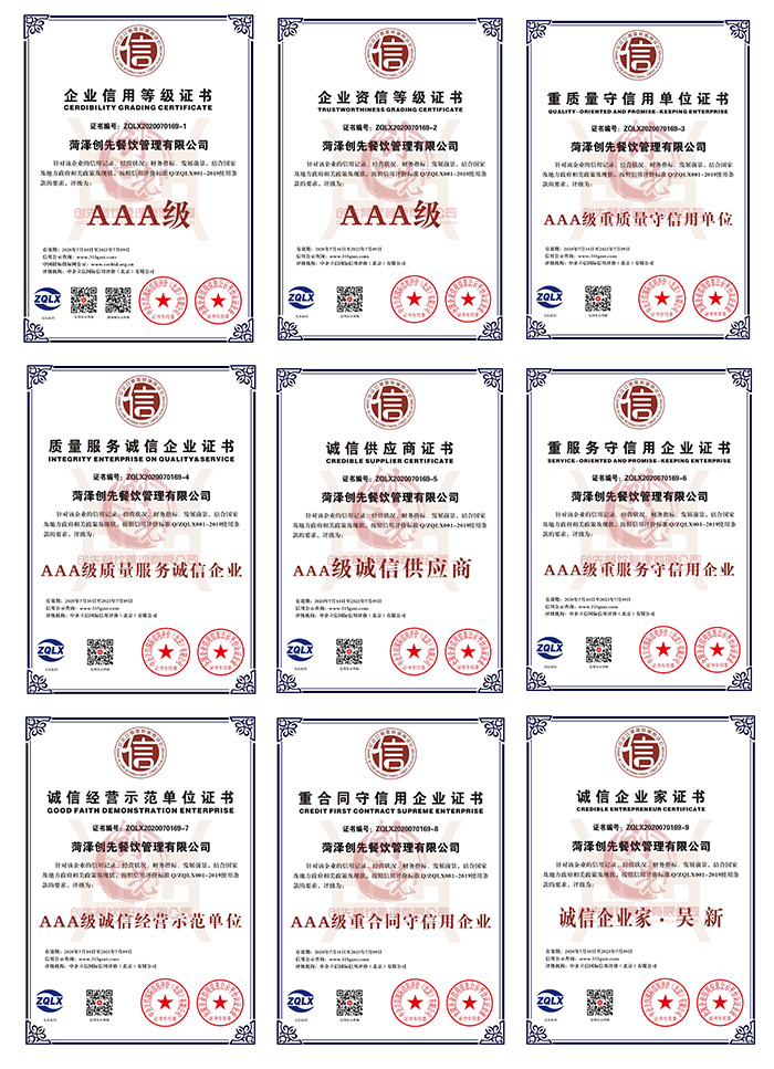 3A级信用企业是一个公司诚信经营的结果,同时也是公司综合实力的体现,创先餐饮管理有限公司多年来,通过诚信经营,只做好产品,本着为顾客负责的态度,获得了广大店主的一致好评,并获得了3A级企业信用等级证书、3A级企业资质等级、重质量守信用单位证书、质量服务诚信企业、诚信供应商、重服务守信用企业证书、诚信经营示范单位证书、重合同守信用证书、诚信企业家称号,对公司来说,信用就是基础,质量是根本,我们会始终坚守诚信的基础,质量的底线去服务好广大顾客
