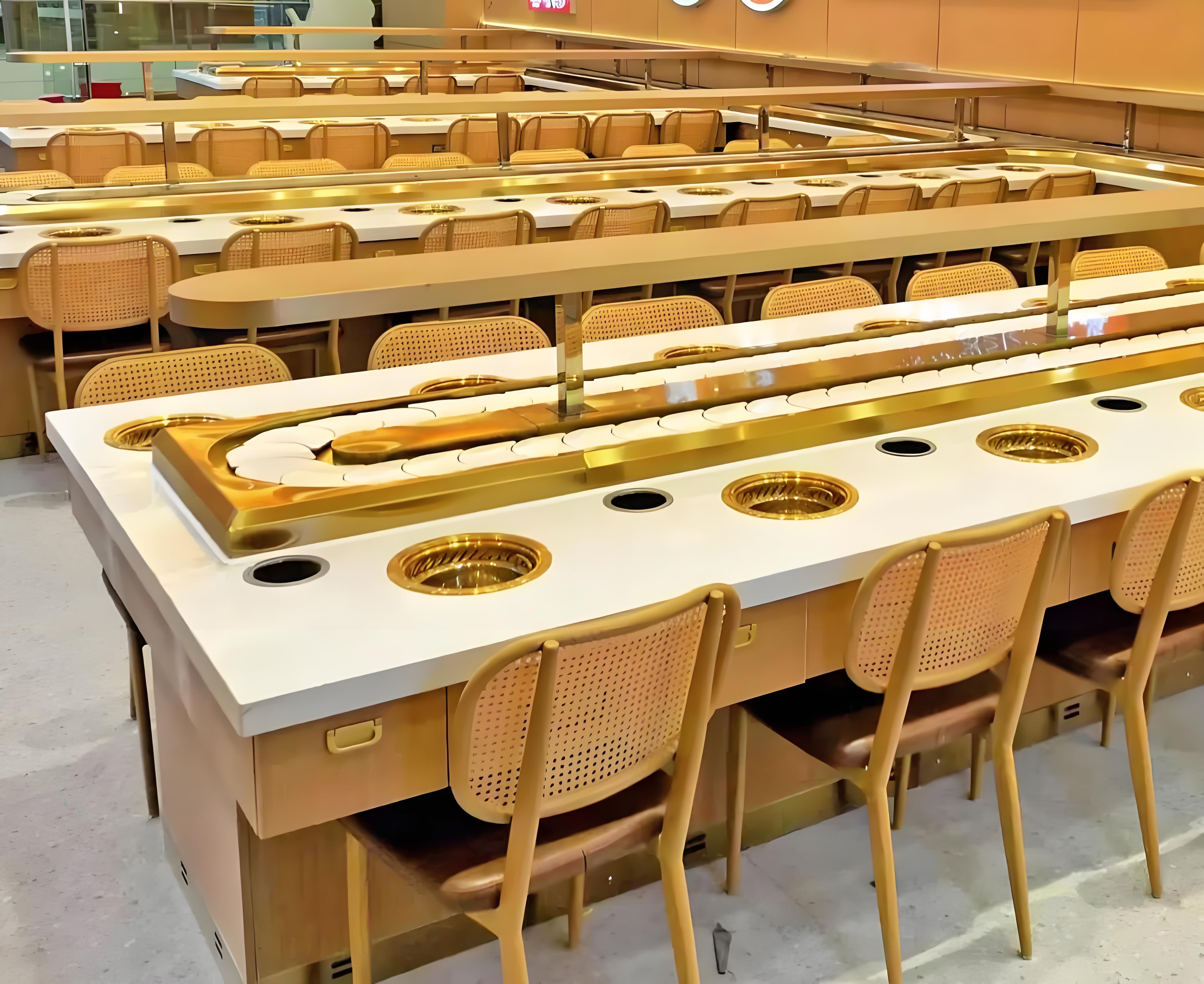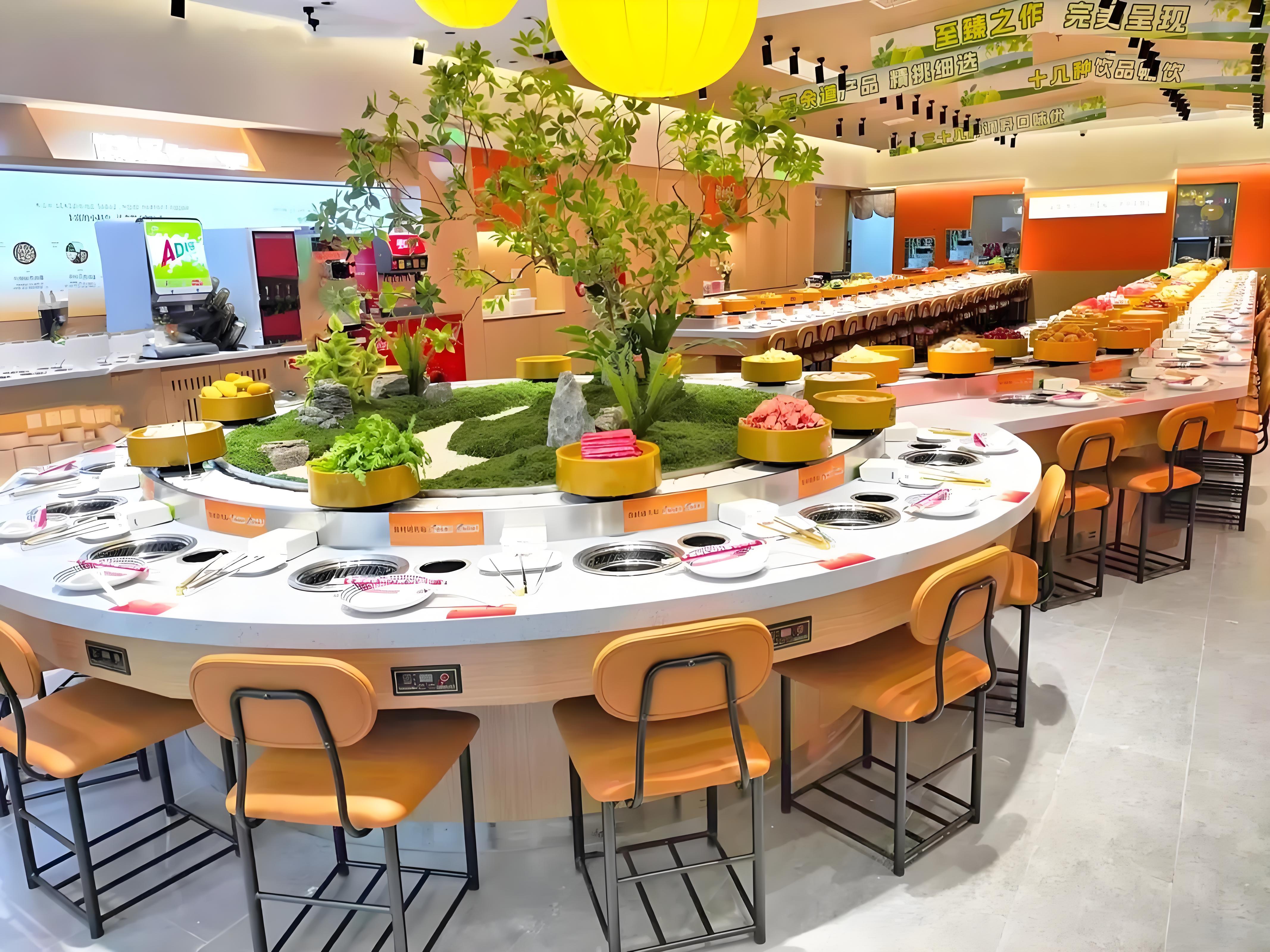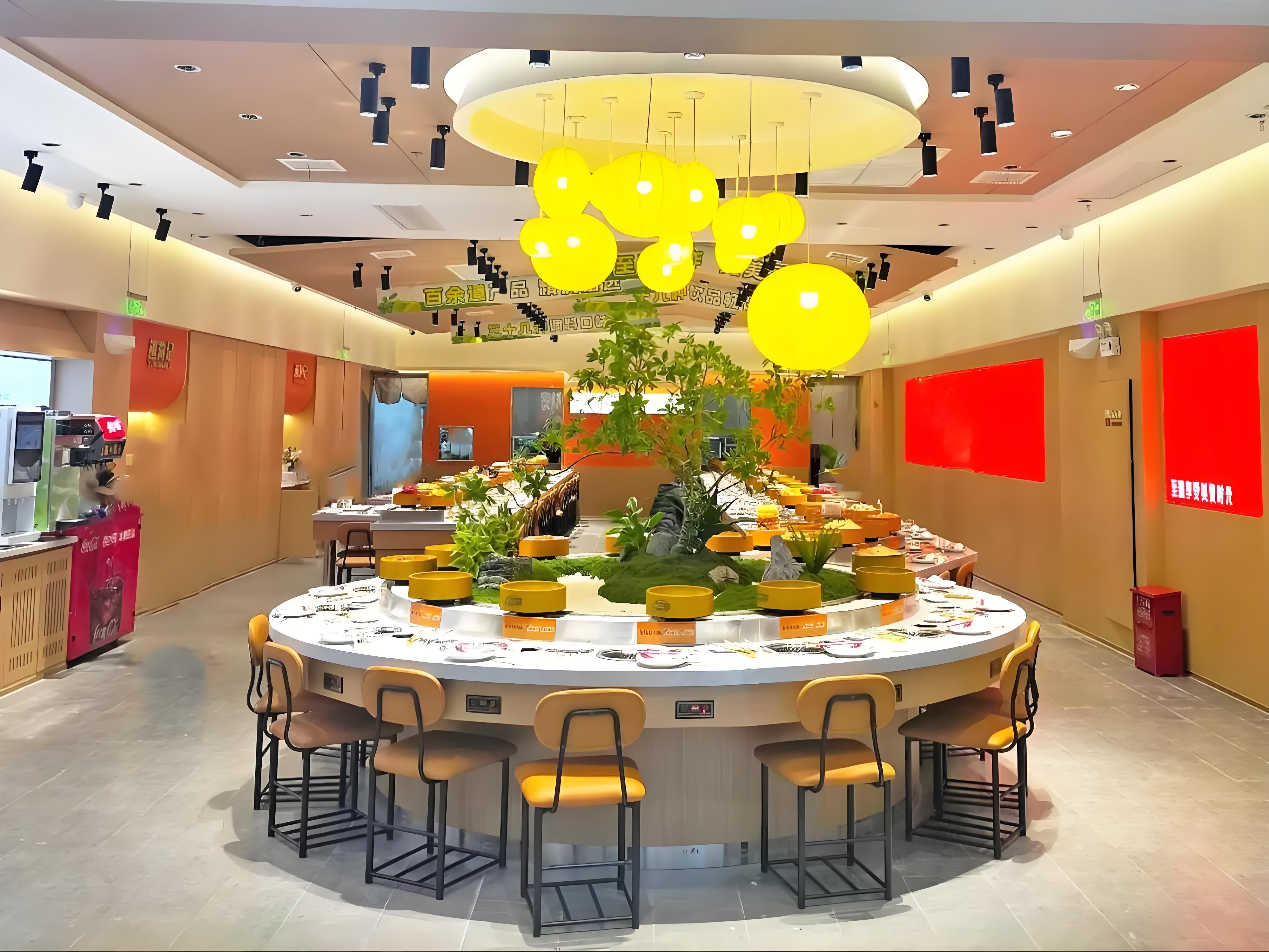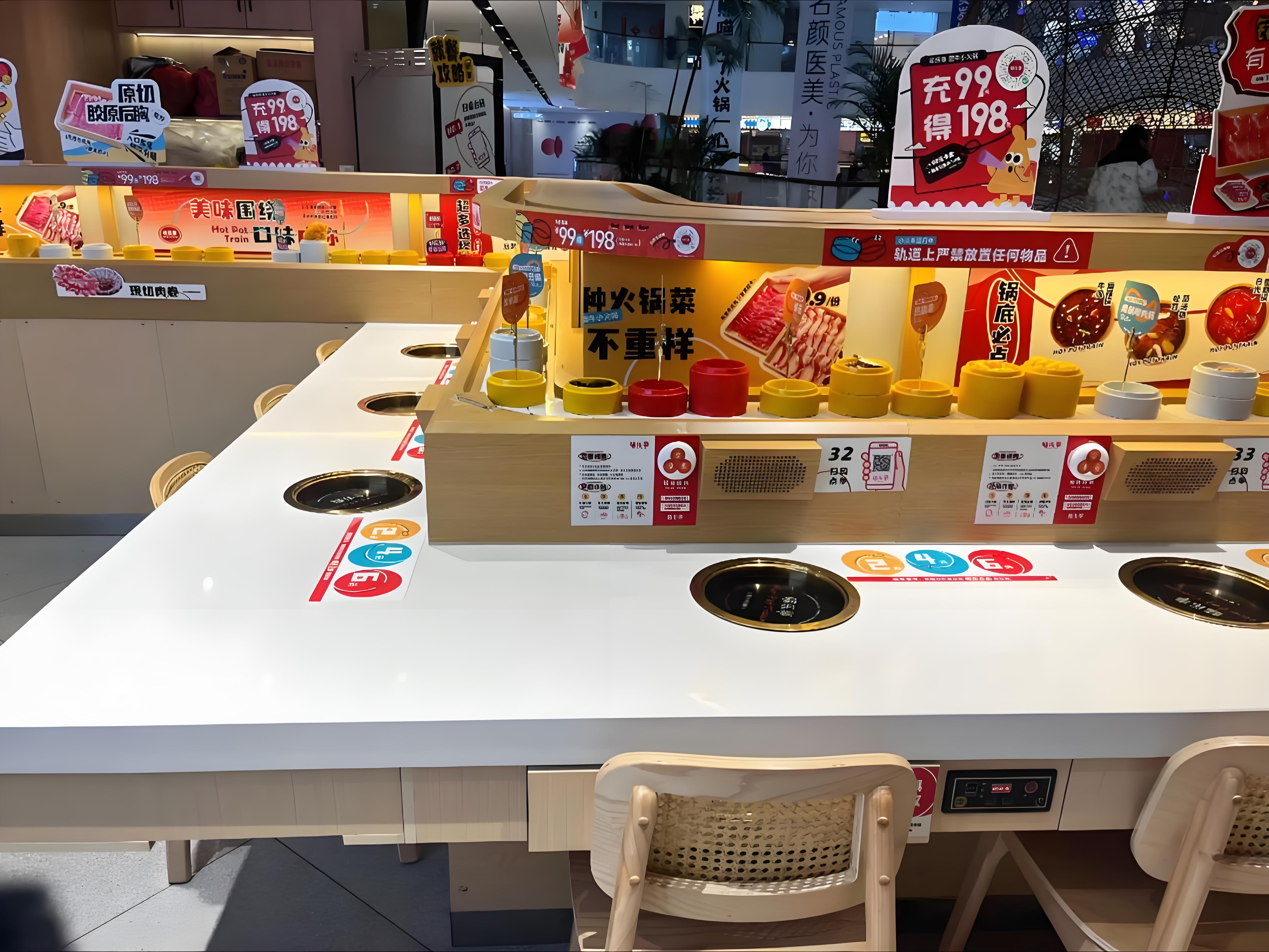 设备还助力服务升级。中岛设评价反馈渠道,助店家把控出品;餐位指示贴明确菜夹用法,夹子与餐盘颜色统一防混淆。涮食与即食菜品用不同餐盘区分,特色菜品配名牌随转展示。座椅下储物空间方便顾客存放物品,节省店内空间。