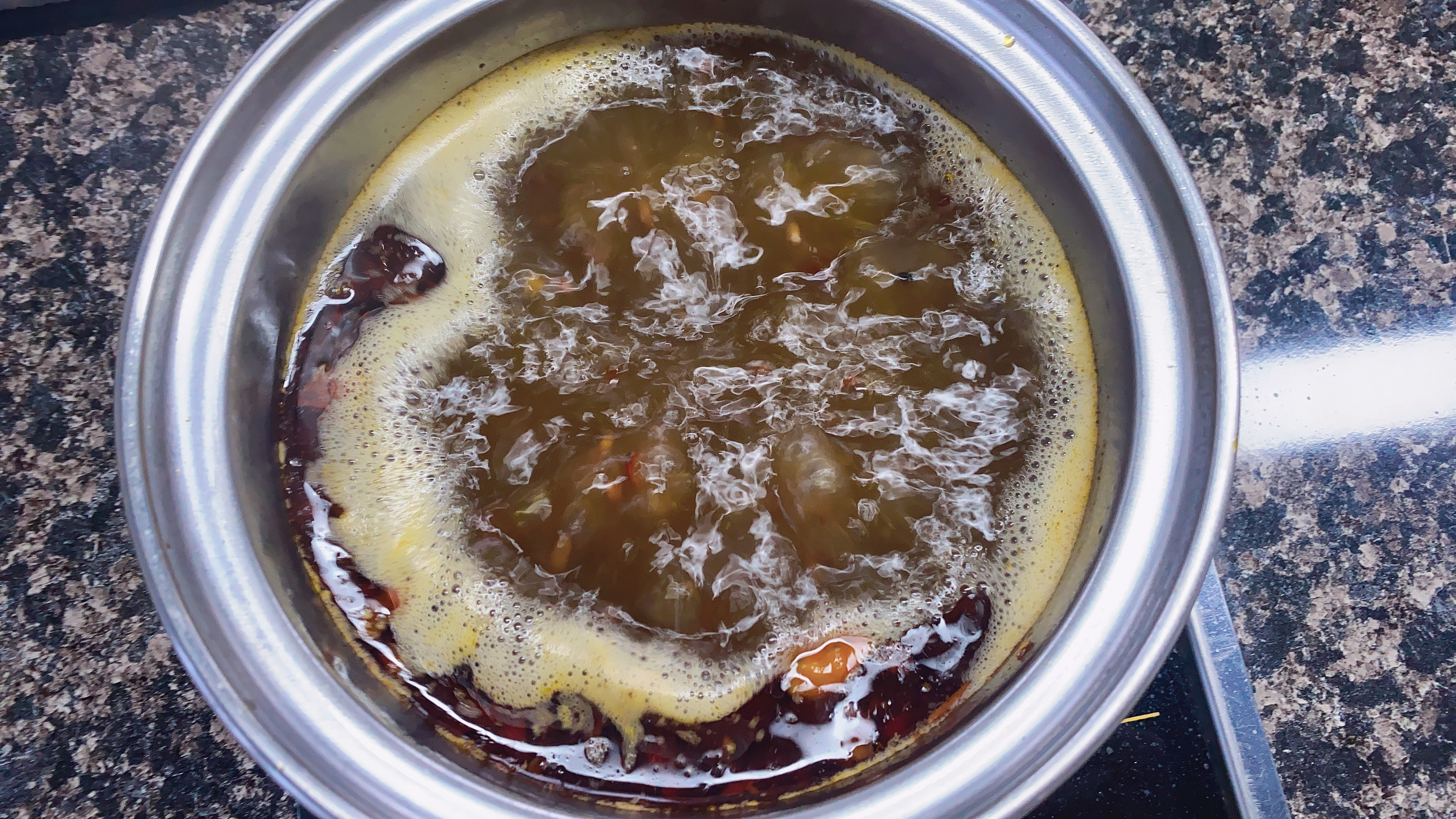 在熬制火锅底料的过程中,我们必须使用小火。首先,我们可以避免油炸火锅底料引起的焦糊苦味。另外,我们可以将原料内部的香与色充分分离,加汤后色泽明亮。在油炸过程中不断搅拌,以均匀加热原料。