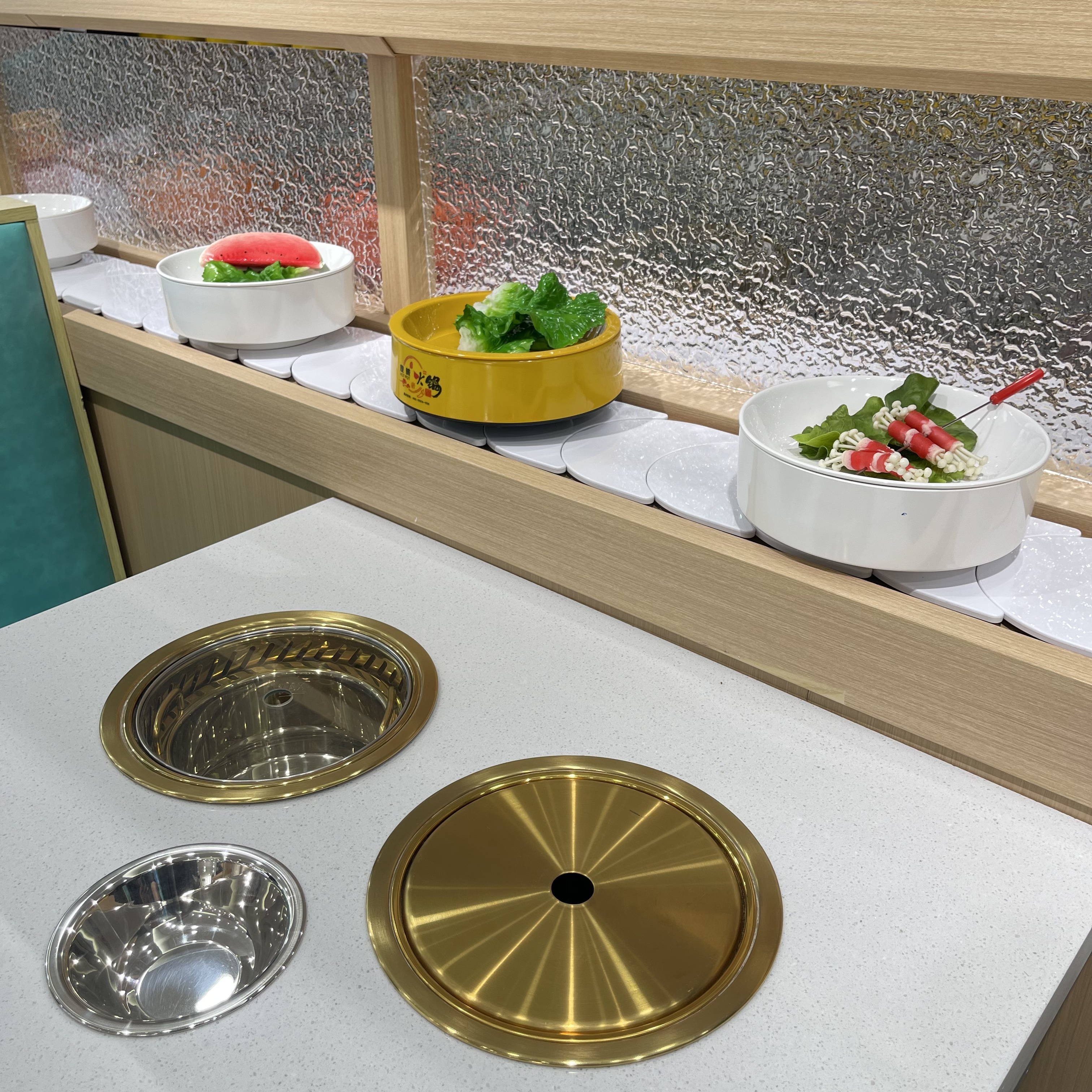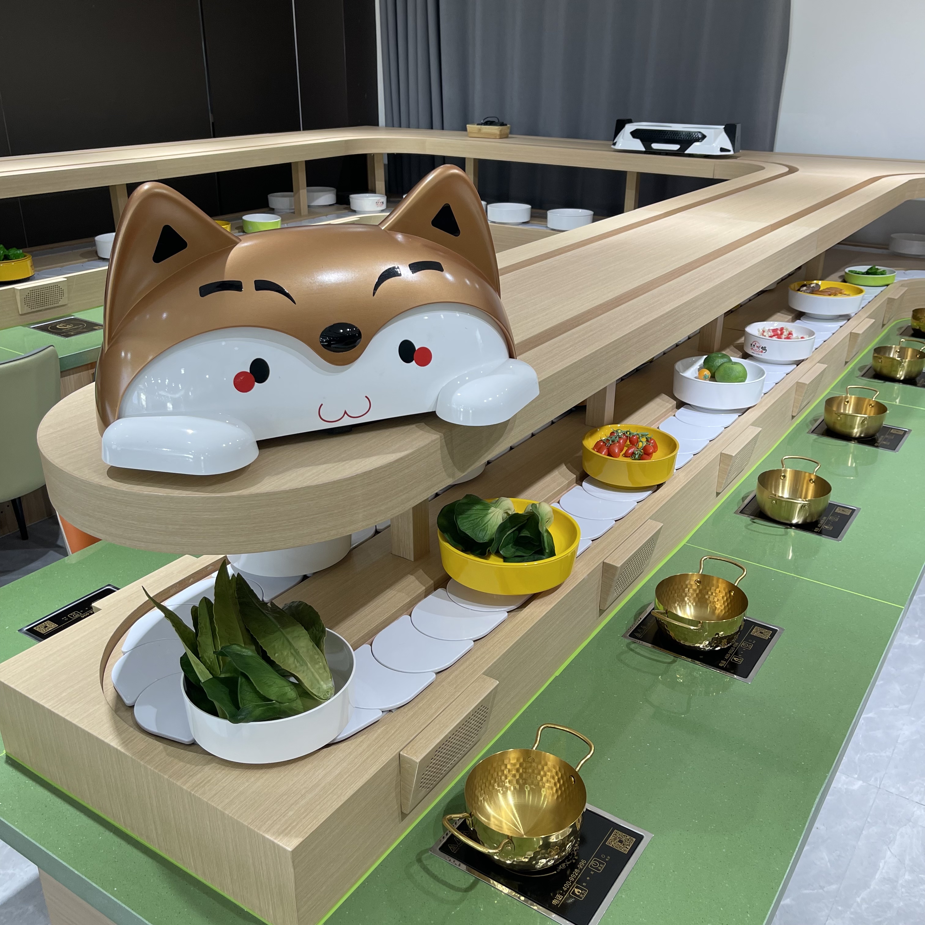 回转线按店面平面图定形状、算周长(周长=长度×2)报价,无隐形收费;单涮餐位≥50cm,涮烤一体≥70cm,科学规划餐位数。